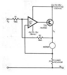Este circuito es de una revista inglesa de 1977. El circuito es todavía actual, bastando usar un TIP41 o 2N3055 para motores hasta unos 3 A. La velocidad del motor es controlada por la tensión de entrada. La resistencia R3 debe tener valores entre 0,5 y 2 ohms, dependiendo de la corriente del motor.