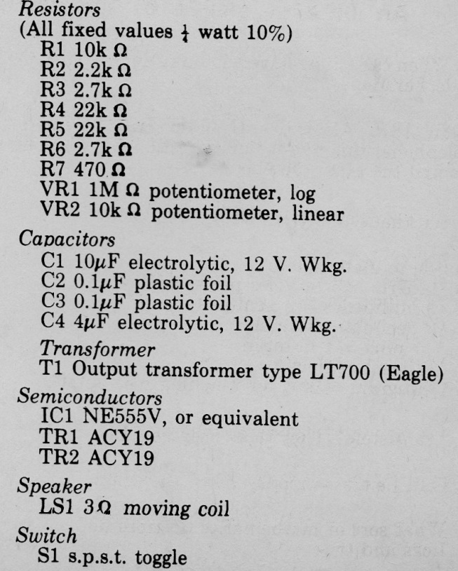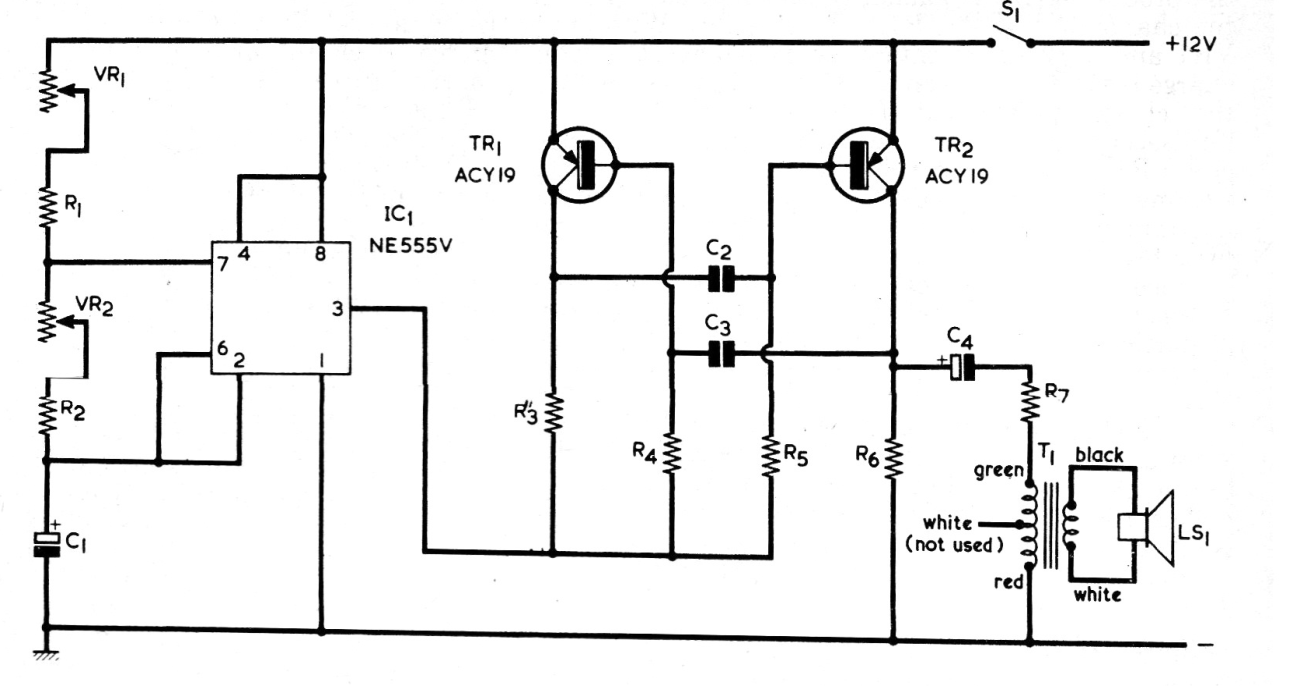 Encontramos este circuito en una Radio & Electronics Constructor de noviembre de 1975. La revista ya no existe, pero el circuito puede ser montado con transistores BC5548. El circuito produce bips en un altavoz. El transformador se puede obtener en un pequeño radio transistorizado fuera de uso. El tono depende de C1 y C2.