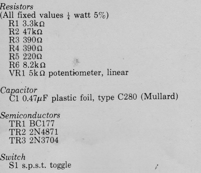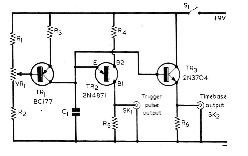 Este circuito fue encontrado en una Radio Electronics Constructor, revista inglesa de abril de 1976; La revista ya no se publica, pero el circuito se puede montar fácilmente con transistores BC558 para TR1, 2N2646 paraTR2 y BC548 a TR3. El rango de frecuencias es determinado por el capacitor.