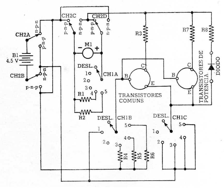 Este circuito fue encontrado en una traducción de 1967, pero puede ser montado con facilidad, pues la mayoría de los componentes se pueden encontrar con facilidad. El circuito mide la ganancia de los transistores en varias pistas y también indica fugas.