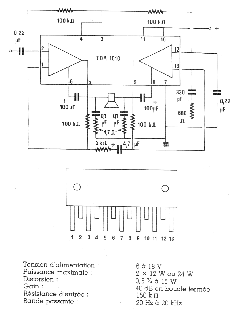 El circuito tradicional fue retirado de una revista francesa Radio Plans que ya no existe, pero puede ser todavía montado pues el CI utilizado todavía puede ser encontrado. La potencia de salida depende de la tensión de alimentación.