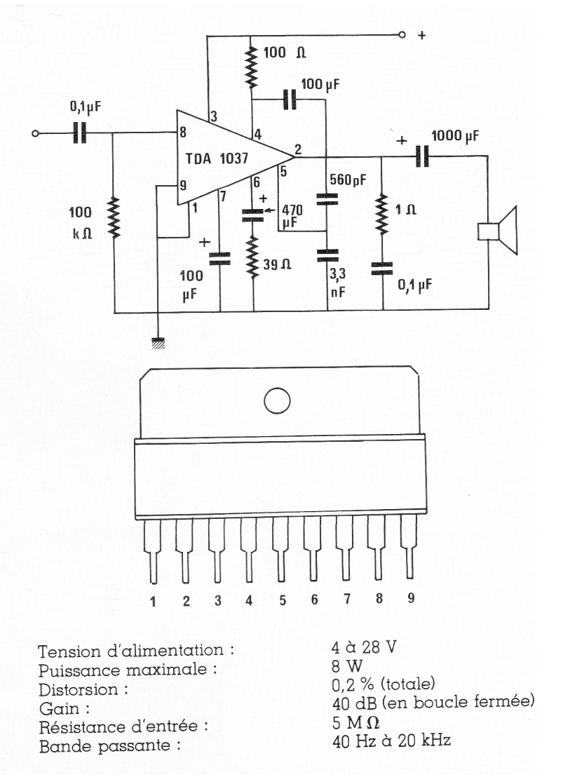El circuito tradicional fue retirado de una revista francesa Radio Plans que ya no existe, pero puede ser montado desde que se encuentre el CI, que no es muy común. La potencia de salida depende de la tensión de alimentación.