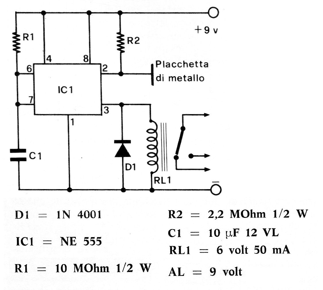 Este circuito fue encontrado en la revista italiana Radio Elettronica de septiembre de 1977. Con él es posible activar un relé con un simple toque en una placa metálica que sirve de sensor. La alimentación debe ser de 6 a 12 V según el relé, y si es del tipo con más de 50 mA de corriente de accionamiento se debe utilizar un paso adicional con transistores para su accionamiento.