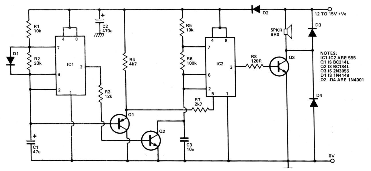 Este circuito fue obtenido en una revista Hobby Electronics de 1980. Se trata de una sirena de tono variable para alarma u otra aplicación con una salida de alta potencia. Este circuito imita el sonido de la alerta roja de la nave Enterprise de la serie Jornada en las Estrellas (Star Trek). Q1 puede ser un BC558 y Q2 el BC548. El transistor Q3 debe estar dotado de un disipador de calor.