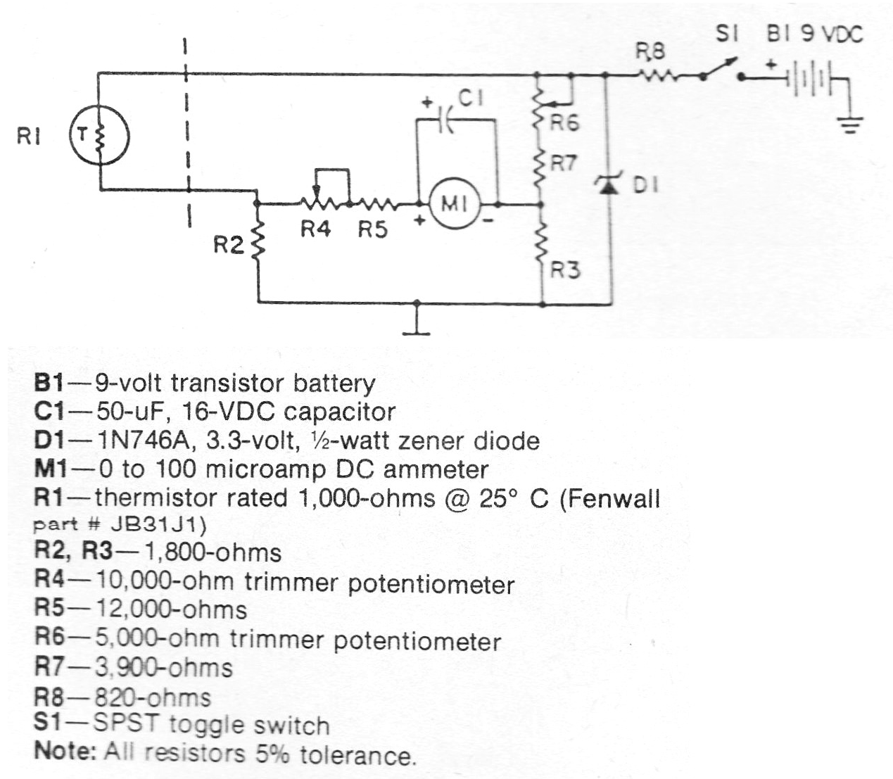 Este circuito es de una publicación americana de 1987 llamada Electronics Handbook. El circuito aún se puede montar fácilmente, ya que todos los componentes son comunes. El sensor, un termistor o NTC puede conectarse al circuito por un largo cable.
