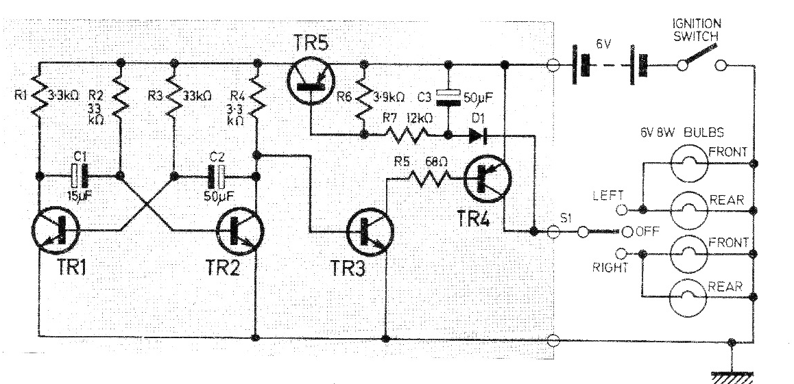 He encontrado este circuito en una revista de 1976, pero todavía se puede montar con facilidad, ya que todos los componentes son comunes. TR1, TR2 y TR3 pueden ser BC548, TR4 puede ser un TIP32 y TR5 un TIP31para lámparas hasta 1 A. El circuito también funciona en 12 V con lámparas de la misma tensión. D1 puede ser un 1N4002.