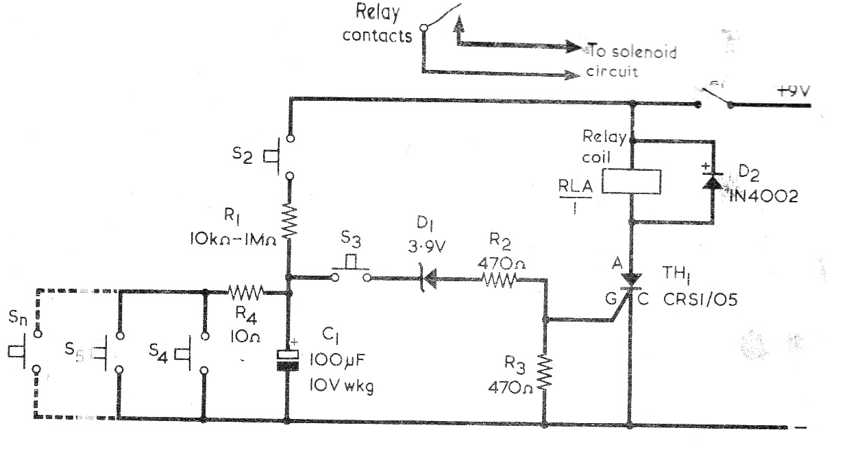 Este circuito fue obtenido en una Radio & Electronics Constructor de marzo de 1976. La revista ya no existe, pero el circuito puede ser montado con SCR del tipo 106. En este circuito la llave S2 carga el capacitor y si las otras llaves son accionadas él descarga. Sin embargo, si S3 se presiona después de S2, la descarga del capacitor hará que el SCR dispare. Por lo que observamos, el diodo D1 está invertido en el diagrama original de la revista.