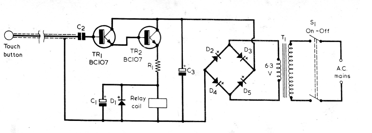 Este circuito fue encontrado en una Radio Electronics Constructor, revista inglesa de junio de 1976; La revista ya no se publica, pero el circuito se puede montar fácilmente con BC547 en lugar del tipo original NPN El relé debe ser y 6 V si el transformador utilizado es de esta tensión, pero se puede utilizar un relé de 12 V. Los diodos son 1N4002, R1 es de 22 ohms y C1 de 10 uF. C2 tiene 220 nF y C3 es un electrolítico de 1 000 uF.