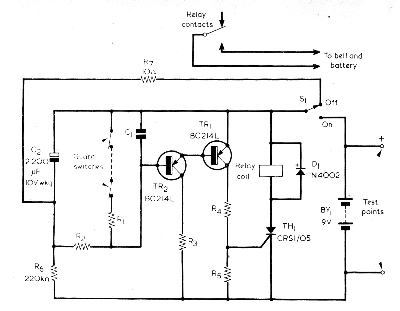 Este circuito fue encontrado en una Radio Electronics Constructor, revista inglesa de junio de 1976; La revista ya no se publica, pero el circuito se puede montar fácilmente con BC558 en lugar de los tipos originales El SCR puede ser el TIC106 y el consumo del circuito es muy bajo en la condición de espera. La alimentación debe estar entre 8 y 15 V, siempre 2 V más que la tensión del relé usado.
