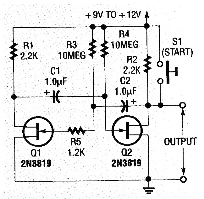 Este circuito se obtuvo en una revista americana Electronics Now de abril de 1993. La revista ya no existe, pero el circuito se puede montar con cualquier JFET común como los BF245. El circuito genera señales rectangulares de frecuencia que depende de los capacitores usados. La alimentación se puede hacer con la batería, ya que el consumo es muy bajo.