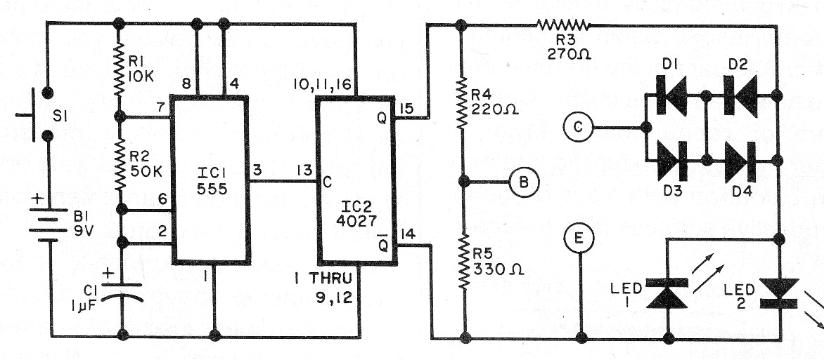 He encontrado este circuito en un Electronics Experimenter Handbook de 1992. El circuito se puede montar fácilmente hoy, ya que todos los componentes son comunes. Lo que hace es probar un transistor, identificando su tipo de una forma directa sin el uso de claves conmutadoras. Los diodos son de uso general 1N4148 o equivalentes.