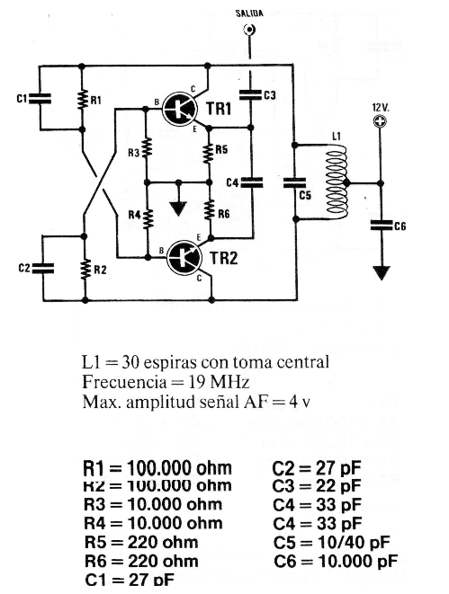 Este circuito genera señales de 19 MHz con la bobina indicada, pero se puede cambiar esta frecuencia con bobinas apropiadas. El circuito es de una revista española y puede ser montado con transistores 2N2222 o BC548. La alimentación se realiza con una tensión de 12 V. Los capacitores deben ser cerámicos.