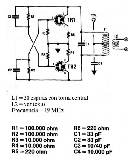 Este circuito genera señales de 19 MHz con la bobina indicada, pero se puede cambiar esta frecuencia con bobinas apropiadas. El circuito es de una revista española y puede ser montado con transistores 2N2222 o BC548. La alimentación se realiza con una tensión de 12 V. Los capacitores deben ser cerámicos.