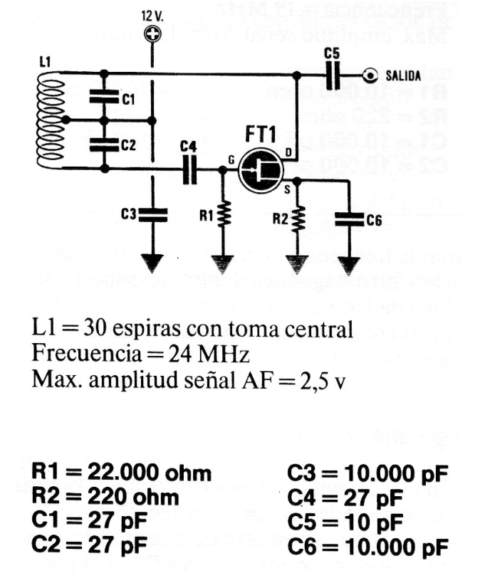 Este circuito genera señales de 24 MHz con la bobina indicada, pero se puede cambiar esta frecuencia con bobinas apropiadas. El circuito es de una revista española y puede ser montado con transistores BF245 o MPF102. La alimentación se realiza con una tensión de 12 V. Los capacitores deben ser cerámicos.