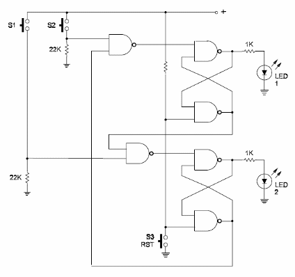 ¿Quién es el más rápido? Este es el otro nombre de este interesante circuito que hace que se detecte quién apretó en primer lugar un interruptor, cuando una señal es dada. El circuito puede ser utilizado en competiciones y utiliza como base un circuito integrado CMOS 4011. La resistencia que está sin valor es de 22 kea alimentación puede ser hecha con tensiones de 5 a 12 V. El circuito es del libro CMOS Sourcebook de Newton C. Que se publicó en los Estados Unidos.