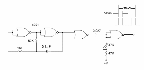 El circuito presentado genera pulsos a intervalos regulares con la duración controlada por un potenciómetro, posibilitando así la prueba de servomotores. El circuito es alimentado con la misma tensión del servo y para informaciones de la pinza del 4001 consulte el libro Curso de Electrónica Digital o en el datasheet disponible en la página principal. El circuito es del libro CMOS Sourcebook de Newton C. Braga, publicado en los Estados Unidos.