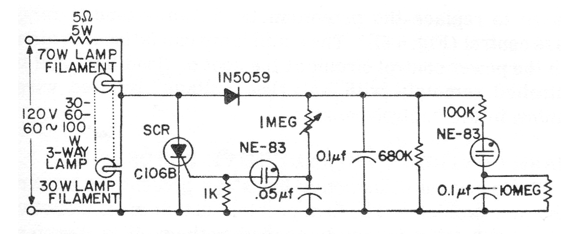 El circuito presentado es de un manual de tiristores americano de 1974, pero puede ser montado con SCRs de la serie 106, como el C106 o TIC106. El circuito hace que dos lámparas incandescentes ligadas en serie varíen su brillo rápidamente imitando una llama o incluso vela. Las lámparas se pueden colocar en una chimenea artificial. El diodo puede ser el 1N4004 y las lámparas deben tener las potencias indicadas o próximas, por ejemplo, 60 W y 25 W que son valores más comunes.