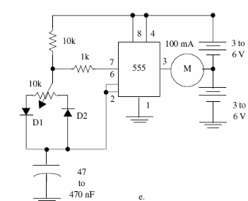 Este circuito de control de motor DC de baja corriente (hasta 100 mA) es del tipo anti-fase, lo que significa que puede controlar también el sentido de rotación del motor. En la posición de ciclo activo 50% el motor para y con la variación para más o para menos, gira en un sentido u otro, con velocidad variable. El capacitor debe ajustarse para el mejor rendimiento de acuerdo con las características del motor. El circuito es del libro Mechatronics Sourcebook de Newton C. Braga, publicado en los Estados Unidos.