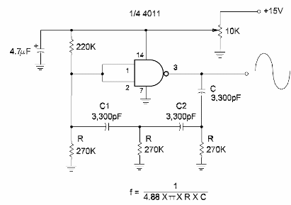 El oscilador por desplazamiento de fase mostrado en la figura genera una buena señal senoidal a partir de un circuito integrado CMOS. La tensión de funcionamiento ideal para la señal sinusoidal debe ajustarse en el potenciómetro de 10 k y la frecuencia dada por los componentes usados según la fórmula. C debe ser igual a C1 y C2. Con los componentes usados la frecuencia de la señal generada es de 10 kHz. El circuito es del libro CMOS Sourcebook de Newton C. Braga, publicado en los Estados Unidos.