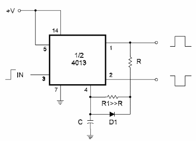 Una transición positiva en la entrada dispara este circuito que tiene sus salidas cambiando de estado por un tiempo dado por R y C. Después del intervalo dado por ese componente las salidas cambian nuevamente de estado. La alimentación puede ser de 5 a 15 V y el diodo es cualquiera de uso general como el 1N4148. El circuito es del libro CMOS Sourcebook de Newton C. Braga, publicado en los Estados Unidos.