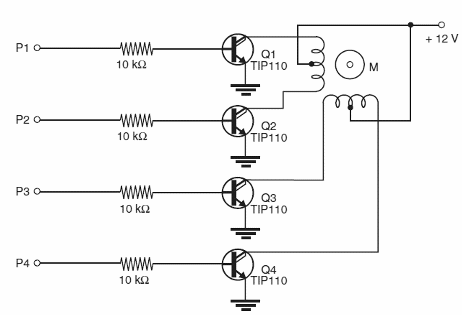 El control de motor de paso mostrado en la figura siguiente utiliza transistores Darlington, presentando así gran sensibilidad. Los transistores deben estar dotados de disipadores de calor y el motor de 12 V puede requerir corriente hasta 1 A. El circuito es del libro Robotics, Mechatronics and Artificial Intelligence, de Newton C. Braga, publicado en los Estados Unidos.