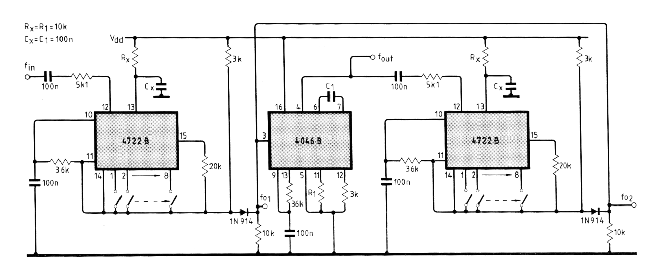 Este interesante circuito que utiliza PLLs CMOS puede dividir la frecuencia de una señal por valores menores que 1. Se trata, por lo tanto, de un multiplicador de frecuencia que puede operar hasta algunos megahertz, según la capacidad del CI. El circuito es de una revista inglesa de 1985, pero puede ser montado con facilidad aún hoy. La señal de entrada se multiplica por (N + 1) / (M + 1) donde N y M se ajustan en el primer y tercer CI. Las frecuencias posibles son de 65 025 valores diferentes.