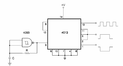 Este circuito genera señales de dos fases con la mitad de la frecuencia de la señal obtenida en el pin 13. Las señales tienen la mitad de la frecuencia de la señal generada por el 4093. La alimentación puede oscilar entre 5 y 15 V. Para más información sobre cómo calcular la frecuencia generada vea en la sección de matemáticas cómo funciona el oscilador 4093 y sus cálculos. El circuito es del libro CMOS Sourcebook de Newton C. Braga, publicado en los Estados Unidos.