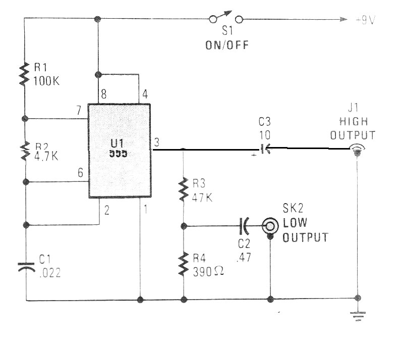 Este circuito está en una edición de julio de 1992 de la revista americana Popular Electronics, pero puede ser montado con facilidad en nuestros días pues utiliza componentes comunes. Se genera una señal rectangular rica en armónicos cuya frecuencia fundamental es dada por R1, R2 y C1. Estos componentes se pueden cambiar en una amplia gama de valores. La alimentación se puede hacer con tensiones de 5 V a 9 V. El circuito tiene salidas de alta (high) y bajas (Low) impedancias.