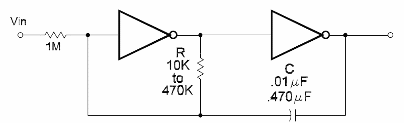 La frecuencia de este circuito puede ser controlada por una tensión aplicada a la entrada Vin. La señal de salida es rectangular y la frecuencia principal depende de R y de C que pueden asumir valores en el rango indicado. La tensión de control puede variar entre 0 y la tensión utilizada en la alimentación. Puertas NAND y NOR CMOS conectadas como inversores se pueden utilizar en este circuito. El circuito es del libro CMOS Sourcebook de Newton C. Braga, publicado en los Estados Unidos.
