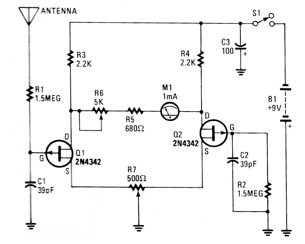 El circuito es de la revista Hands-On Electronics de Estados Unidos, edición de febrero de 1987. La revista ya no existe, pero el circuito puede ser montado como par de transistores BF245. El sensor es una antena telescópica o simplemente un pedazo de hilo común rígido. El ajuste del equilibrio se realiza en R7 y de fondo de escala en R6. Para un mejor funcionamiento, busque un instrumento con cero en el centro de la escala.