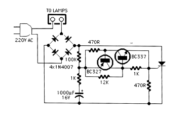 Este circuito se obtuvo en una revista inglesa del año 2000. El circuito se puede montar fácilmente, ya que los componentes son comunes. El SCR puede ser el TIC106. La frecuencia de los intermitentes se puede cambiar con el cambio de los componentes. El circuito sólo funciona como lámparas incandescentes.