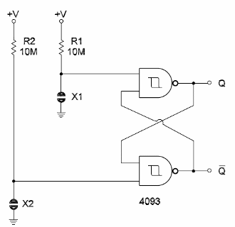 Este circuito consiste en un flip-flop o biestable accionado por el toque en dos sensores. X1 se enciende y X2 se apaga. El circuito utiliza dos de las cuatro puertas del 4093 y debe ser alimentado obligatoriamente por fuente aislada con transformador. La salida puede excitar etapas de potencia con relés u otros tipos de carga. El circuito es del libro CMOS Sourcebook de Newton C. Braga publicado en los Estados Unidos.