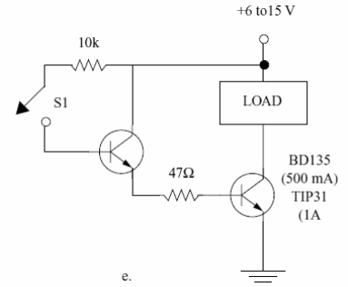 Con este circuito podemos controlar una carga de 500 mA a 1 A, según el transistor, usando un sensor o interruptor de baja corriente, por ejemplo, un reed switch. El transistor de potencia debe estar dotado de un radiador de calor y la carga puede ser de 6 a 15 V. El transistor conductor puede ser el BC548 o equivalente. El circuito es del libro Mechatronics Sourcebook de Newton C. Braga, publicado en los Estados Unidos.