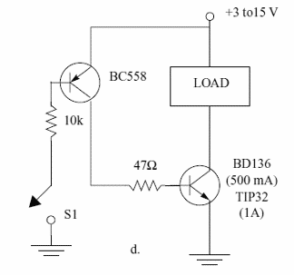 Con este circuito podemos controlar una carga de 500 mA a 1 A, según el transistor, usando un sensor o interruptor de baja corriente, por ejemplo, un reed switch. El transistor de potencia debe estar dotado de un radiador de calor y la carga puede ser de 3 a 15 V. El circuito es del libro Mechatronics Sourcebook de Newton C. Braga, publicado en los Estados Unidos.