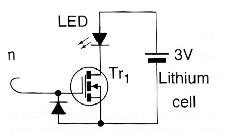 Este simple circuito que sensorial cables de energía (corriente alterna) por el campo producido fue encontrado en una revista inglesa de 2003. Todavía puede ser montado con facilidad, pues el MOSFET puede ser de cualquier tipo. El sensor es un pedazo de hilo de unos 15 cm, formando una pequeña antena y que sirve para "captar" el ronco AC, encendiendo el LED. El MOSFET puede ser de cualquier tipo.