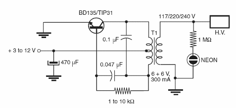 Este circuito puede ser usado como electrificador o aún estimulador en experimentos de fisiología. El circuito genera una alta tensión a partir de pilas medias o grandes. La lámpara de neón es opcional, sirviendo sólo para indicar que el circuito está generando alta tensión. Dependiendo del transformador, los capacitores deben ser alterados para obtener mayor rendimiento.