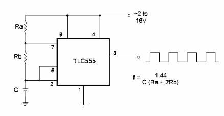 El circuito integrado TLC555 consiste en la versión CMOS del conocido astable 555. Podemos usarlo de la misma forma, como muestra la figura. La fórmula para calcular la frecuencia se da junto al diagrama. La frecuencia máxima es de 2 MHz. El consumo es bajo. El circuito es del libro CMOS Sourcebook de Newton C. Braga.