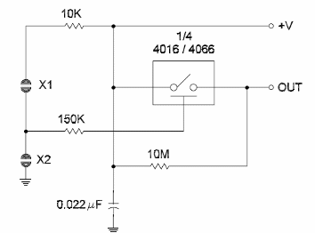 Este circuito fue sugerido en mi libro CMOS Sourcebook, publicado en los Estados Unidos. Se trata de un biestable o flip-flop de toque. Un toque en X1 conecta el circuito y un toque en X2 se apaga. Al conectar la salida va al nivel alto y al apagar, va al nivel bajo. La alimentación se puede hacer con tensiones de 5 a 15 V. Nunca utilice fuente sin transformador para alimentar este circuito.