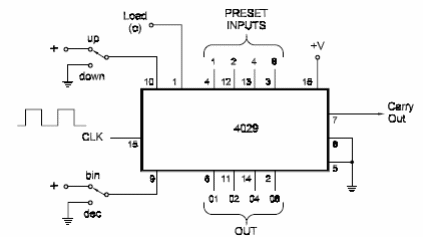 En la figura tenemos el modo de utilizar un circuito integrado 4029 como contador Up-Down (progresivo-regresivo). El circuito integrado 4029 tiene tecnología CMOS pudiendo ser alimentado con tensiones de 5 a 15 V. El conteo puede ser en binario o decimal, conforme la programación de la llave. El circuito es del libro CMOS Sourcebook de Newton C. Braga, publicado en los Estados Unidos.