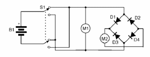 Con este interesante circuito de control, cuando la llave S1 cambia de posición sólo M1 invierte el sentido de rotación, mientras que M2 mantiene el mismo sentido de rotación. Para los diodos 1N4002 los motores pueden tener hasta 12 V con corrientes hasta 1 A. Este circuito es de mi libro Robotics, Mechatronics and Artificial Intelligence, publicado en los Estados Unidos. Para motores de mayor corriente los diodos usados deben ser compatibles.