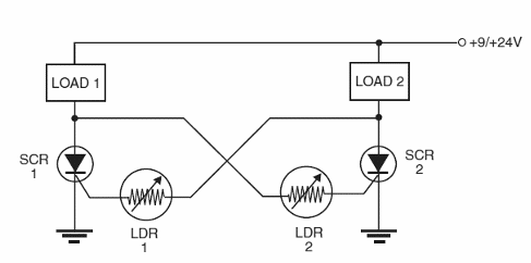 Este circuito es de mi libro Robotics, Mechatronics and Artificial Intelligence. Lo que tenemos es clave de prioridad donde el SCR accionado y, por lo tanto, su carga, corresponde al LDR que se ilumina en primer lugar. Se debe compensar la caída de tensión de 2 V en el SCR y los recursos ópticos deben ser agregados a los SCR para que el disparo ocurra de la forma deseada, sólo con las fuentes de luz de accionamiento.