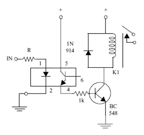 Este circuito de shield se obtuvo en mi libro Mechatronics Sourcebook. Muestra cómo utilizar un acoplador óptico común como el 4N25 para disparar un relé. El transistor controlador es el BC548 o el equivalente y los relés de 6 a 24 V se pueden controlar. La ventaja de este circuito es que la tierra del LED emisor del acoplador puede ser diferente de la tierra de la unidad con transistores, garantizando aislamiento entre los circuitos.