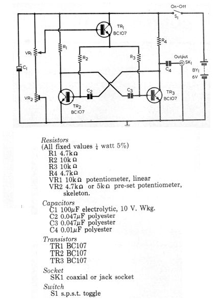 Este circuito simple fue encontrado en una Radio & Electronics Constructor de 1978, pero puede ser montado con facilidad utilizando transistores BC548 en lugar de los originales. La tensión aplicada por VR1 a la base del transistor controla la frecuencia del circuito que genera una señal rectangular. La frecuencia depende de C2 y C3 que pueden tener valores alterados en el circuito. Para los valores indicados, tendremos una frecuencia de algunos quilohertz.