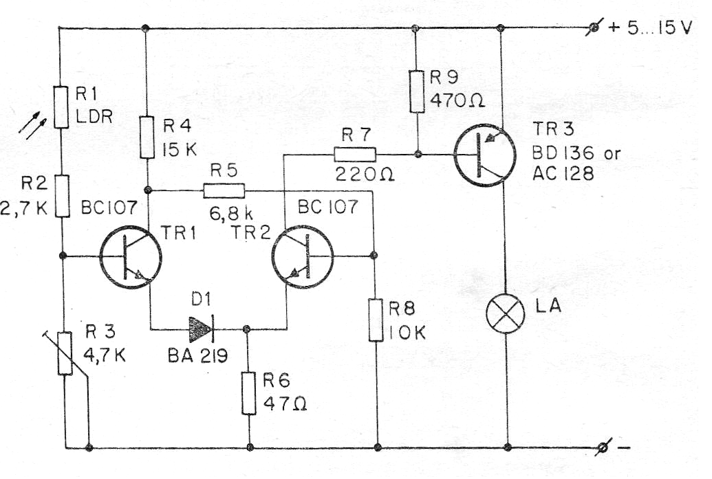 Este circuito fue obtenido en una revista de 1972, pero es todavía actual, pues todos los componentes usados son comunes. Este circuito acciona una lámpara incandescente de emergencia cuando se oscurece o cuando deja de incidir la luz sobre el LDR. La alimentación de 5 a 15 V depende sólo de la lámpara utilizada cuya corriente máxima es de 500 mA. Los transistores BC107 pueden ser reemplazados por los BC547, sus equivalentes actuales.