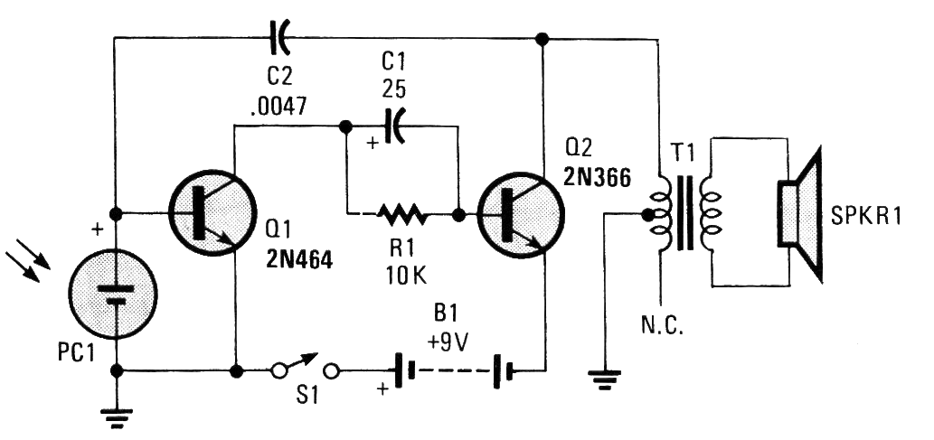 He encontrado este circuito en una Popular Electronics de enero de 1991, pero el circuito todavía se puede montar con transistores equivalentes modernos. Los transistores pueden ser los BC548 y la foto-célula aprovechada de una calculadora u otro equipo solar fuera de uso. El transformador es de salida obtenido de una radio antigua. Los capacitores se pueden cambiar para cambiar la banda de sonidos producidos.