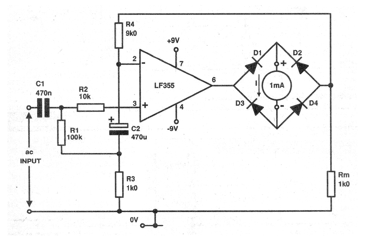 Este circuito fue obtenido en una publicación inglesa de 1993, pero puede ser montado con cierta facilidad, bastando obtener el circuito integrado. Con él podemos usar un miliamperímetro de 0-1 mA en un voltímetro de alta resistencia de entrada. Los diodos son de uso general y la fuente de alimentación debe ser simétrica. Los resistores deben ser de precisión.