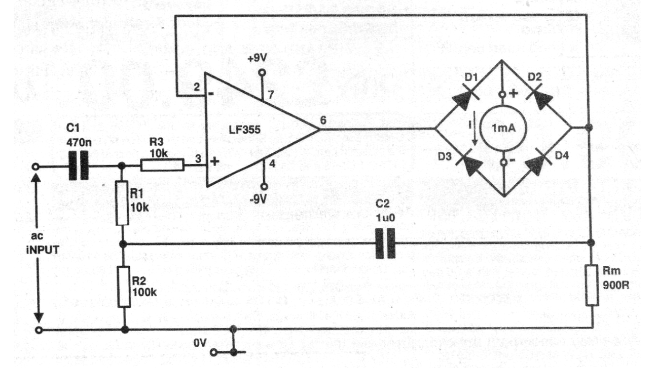 Este circuito fue obtenido en una publicación inglesa de 1993. Se trata de un amplificador para instrumentación que permite utilizar un miliamperímetro de 0-1 mA como voltímetro de 0-1 V. El interesante de este circuito es que su resistencia de entrada para medidas CA es de 200 M ohms. El circuito debe ser alimentado por una fuente simétrica. Los resistores deben ser de precisión.