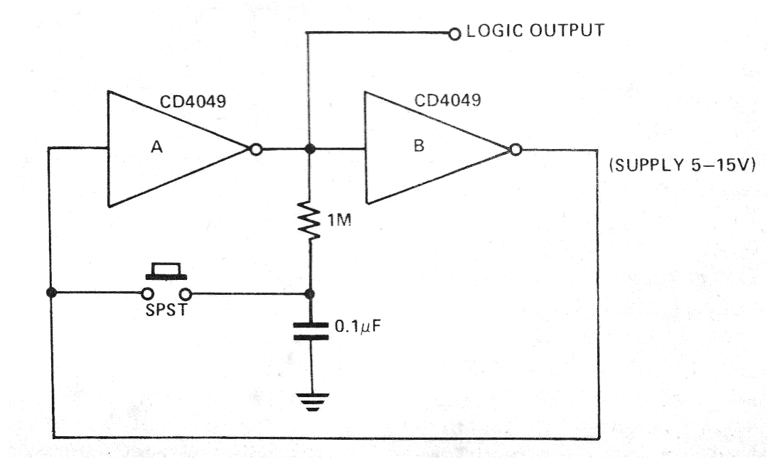En este circuito la salida cambia de estado a cada toque en el interruptor de presión. El circuito es CMOS pudiendo ser alimentado con tensiones de 5 a 15 V típicamente y la salida necesita ser bufferizada para poder excitar circuitos de mayor potencia. El tiempo de acción es de 100 ms, dado por el valor del capacitor, que puede ser alterado.