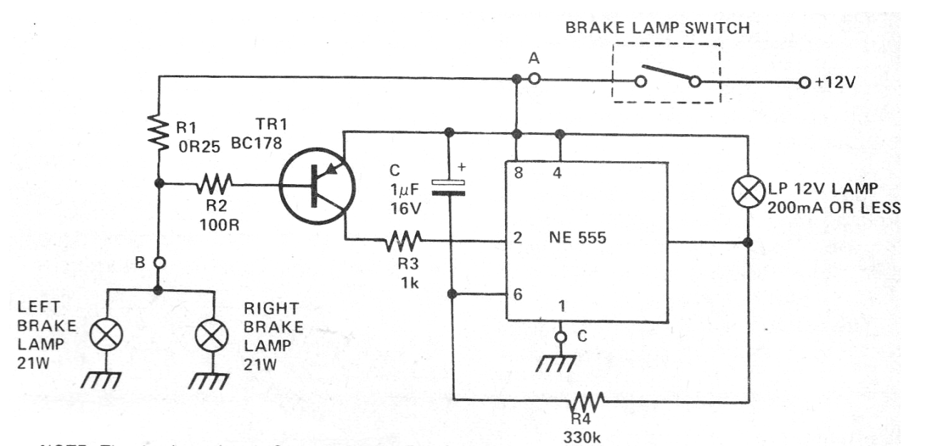 Este circuito fue obtenido en una antigua publicación inglesa de 1976, pero puede montarse con facilidad aún hoy, bastando usar el BC558 en lugar del transistor original. Lo que el circuito hace es accionar una pequeña lámpara de advertencia, que puede ser sustituida por un LED en serie con un resistor de 1k, m cuando una de las luces de freno quema. El circuito saca la alimentación de la propia batería del coche.
