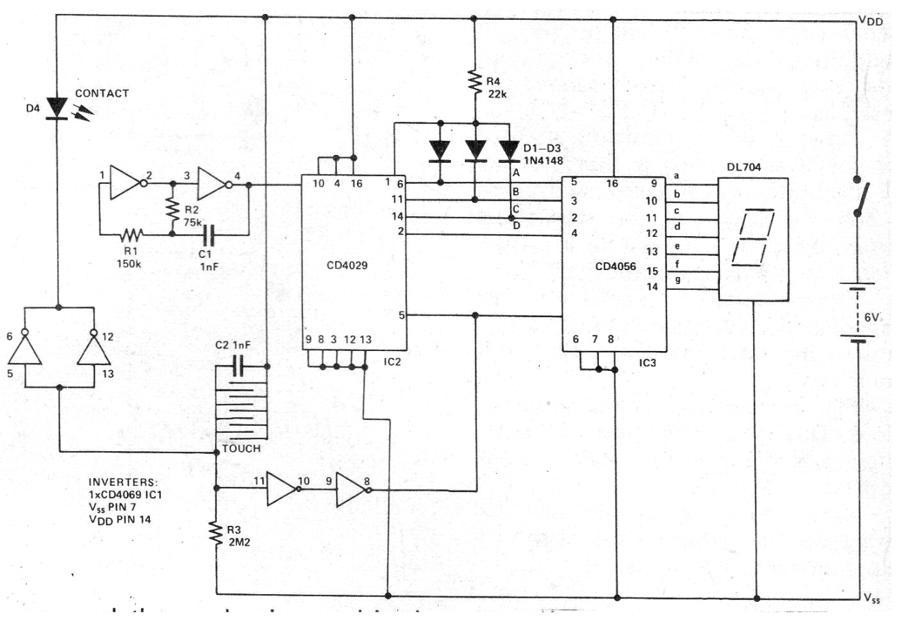 Este circuito fue obtenido en una revista inglesa de 1976, pero puede montarse con facilidad aún hoy, pues los circuitos integrados usados son comunes. El display es del tipo de 7 segmentos de cátodo común y la alimentación se puede hacer con 4 pilas. Al accionar el circuito, muestra en el display un número aleatorio de 1 a 6. El accionamiento es por toque en un sensor formado por chapas de metal o placa de circuito impreso en el patrón indicado.